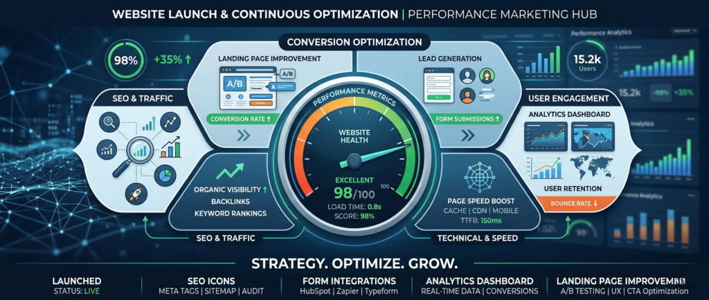 We test speed, mobile responsiveness, forms, and tracking, then launch with a clear checklist.