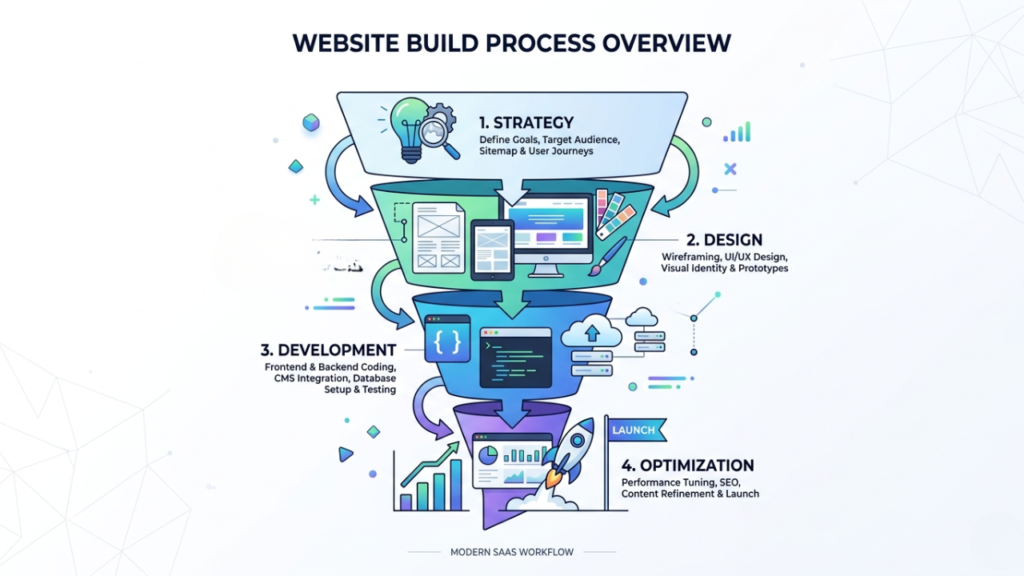 We review your current site (if you have one), competitors, and goals, then plan structure and tech stack.