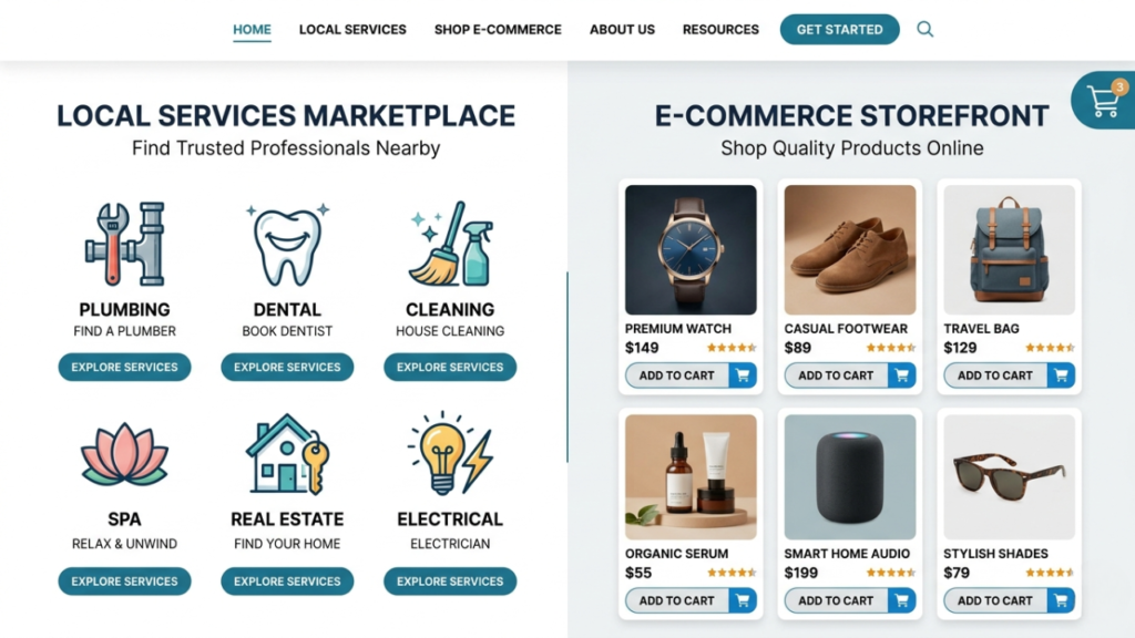 We design and develop websites for local services (cleaning, plumbing, dental, chiropractors, spa, real estate, etc.) and online stores that want more calls, appointments, and orders—not just a pretty homepage.